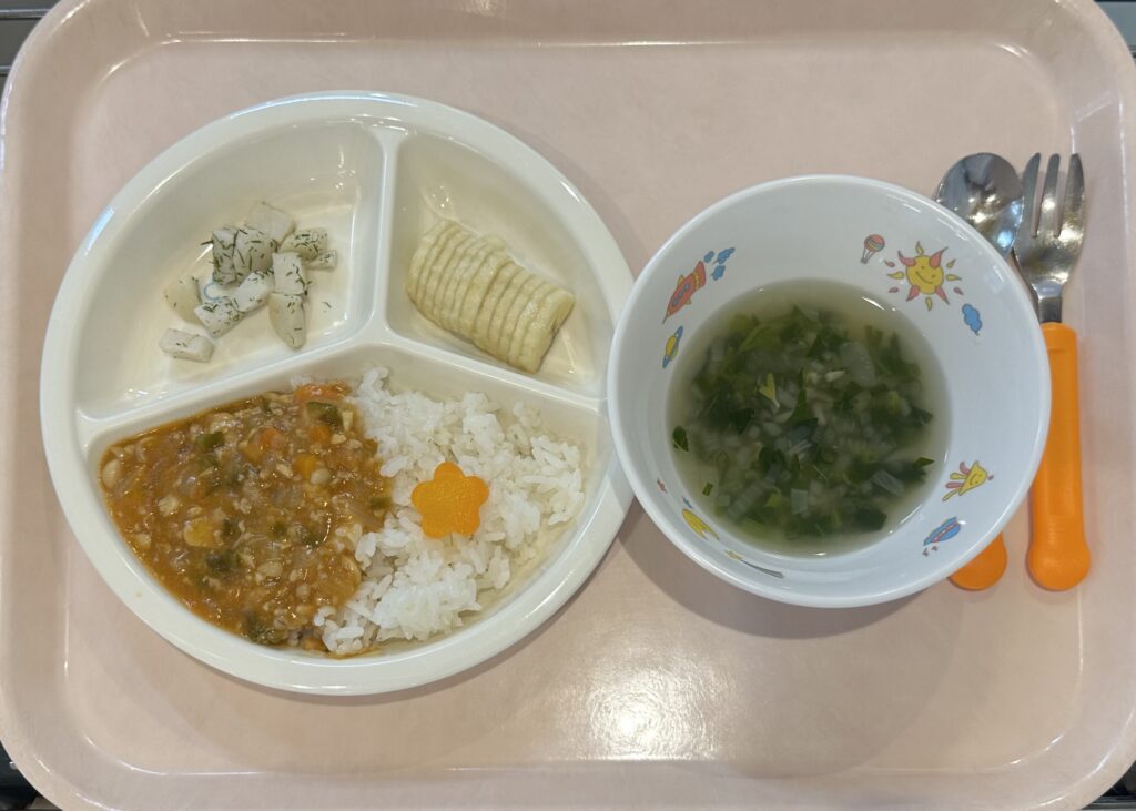 ビーンズライス(夏),わかめスープ(もやし),ベイクド里芋(青のり),バナナ