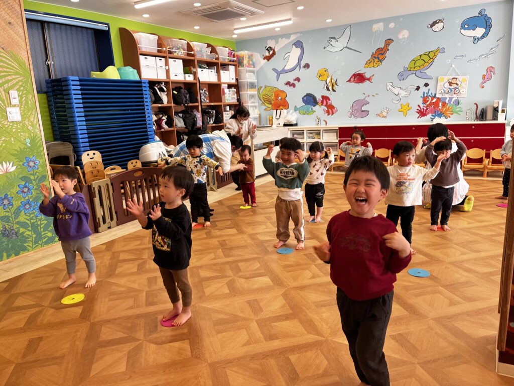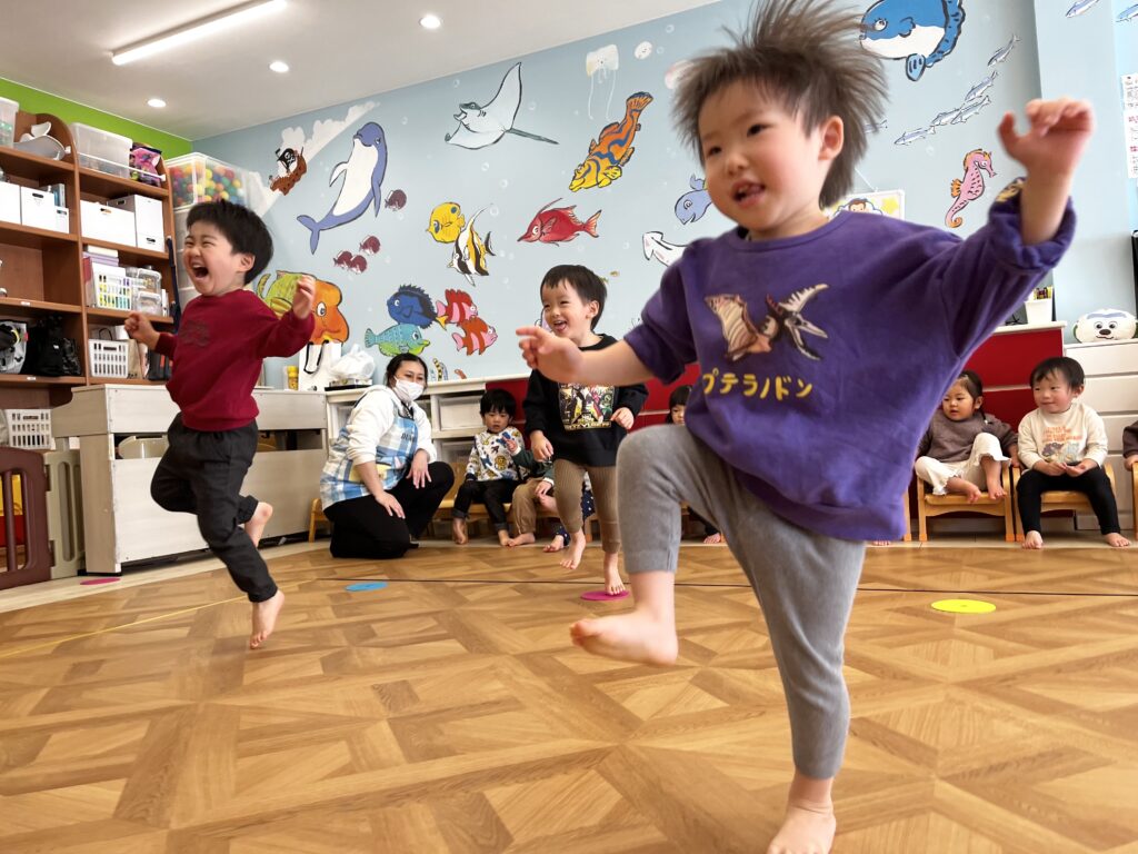 音楽に合わせて体を動かし、楽しく運動に挑戦しました。