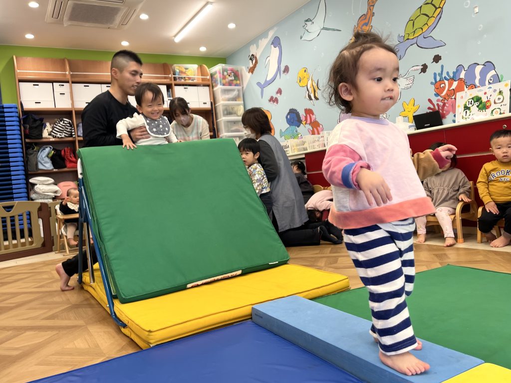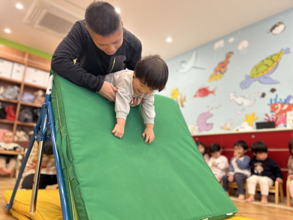 ライオンさんに変身して「がおー!」と元気にマットを移動したり、ワニさんになって低く体を伸ばしながら進んだりと、とっても楽しそうでした!💪✨ さらに、マットを重ねてちょっぴり段差ができても、みんな上手にバランスを取りながら乗り越えていましたよ!