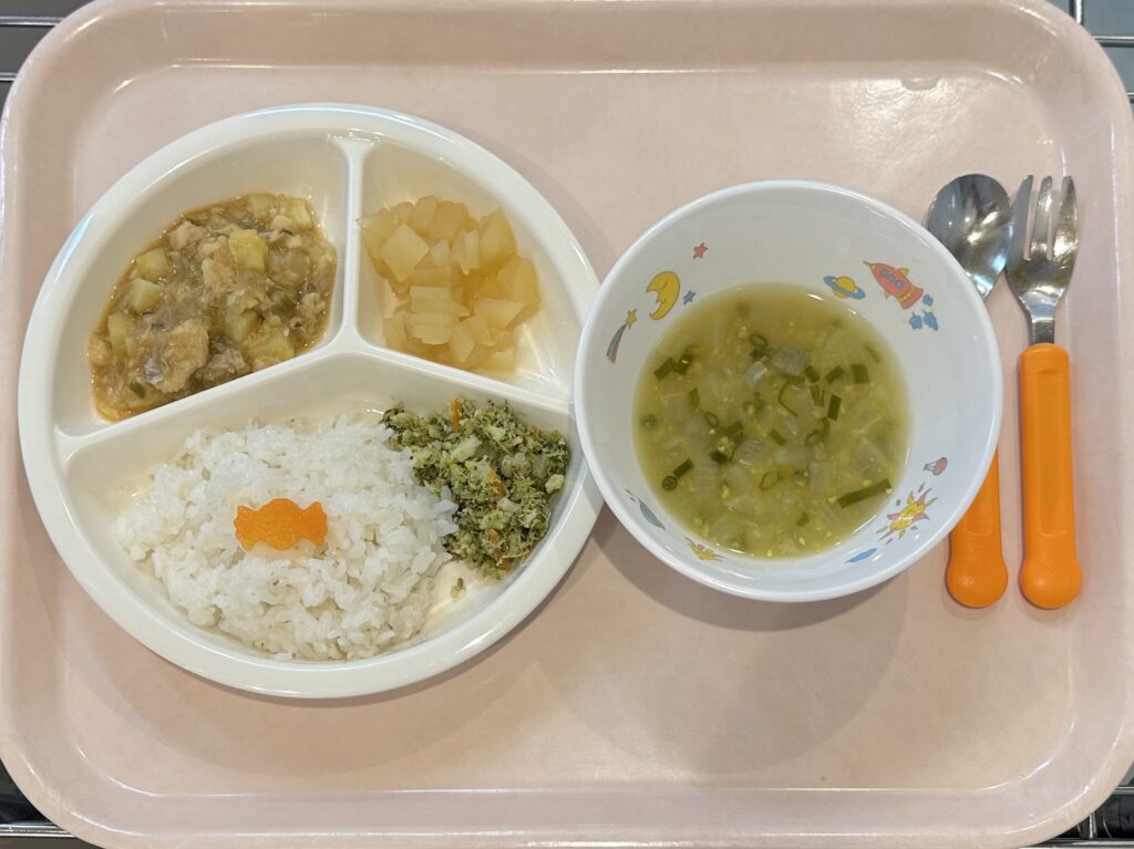 御飯,コーン汁(だいこん),赤魚とさつま芋のケチャップ煮,ブロッコリーのごま和え,りんご