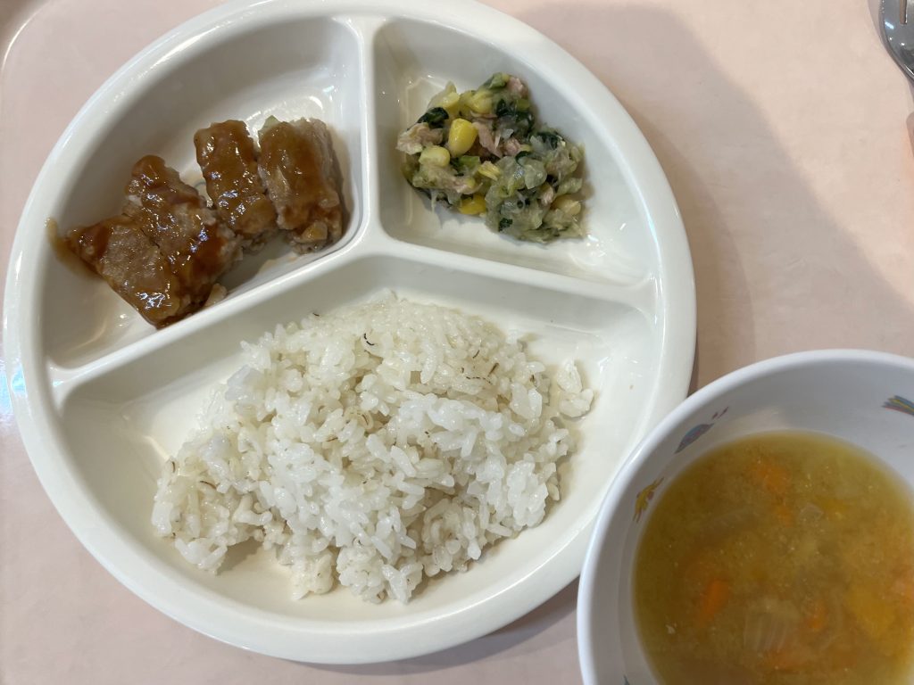 御飯,みそ汁(かぼちゃ),ハンバーグ,小松菜のツナ酢あえ(キャベツ)