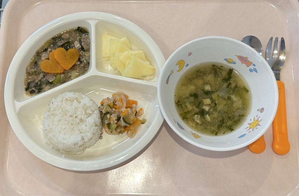 おかゆ、みそ汁、切干大根と豚肉のあんかけ、煮リンゴ