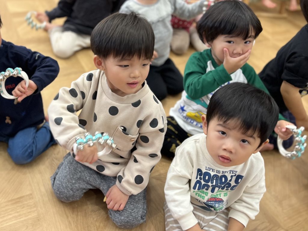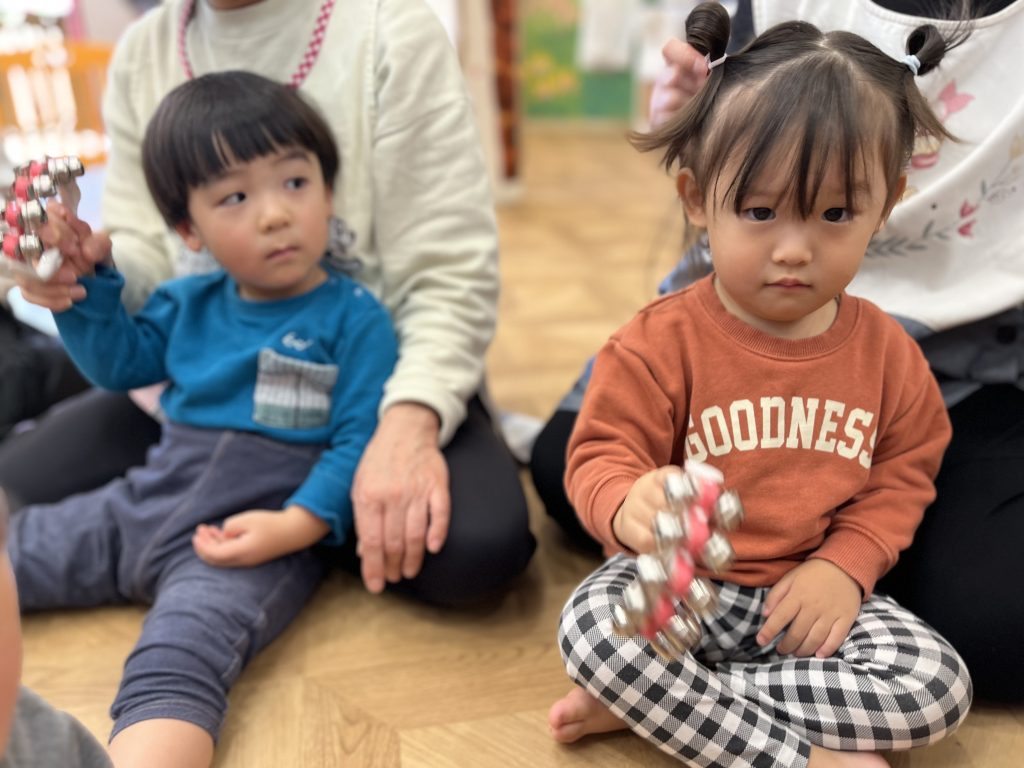 普段から朝の会で「ジングルベル」や「赤鼻のトナカイ」などのクリスマスソングを歌っている子どもたち。今日はその練習の成果を発揮するチャンスです!先生のピアノに合わせて、子どもたちは小さな手で鈴をシャラシャラと鳴らしていました。そのリズム感には先生もびっくり✨!