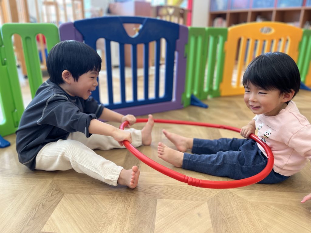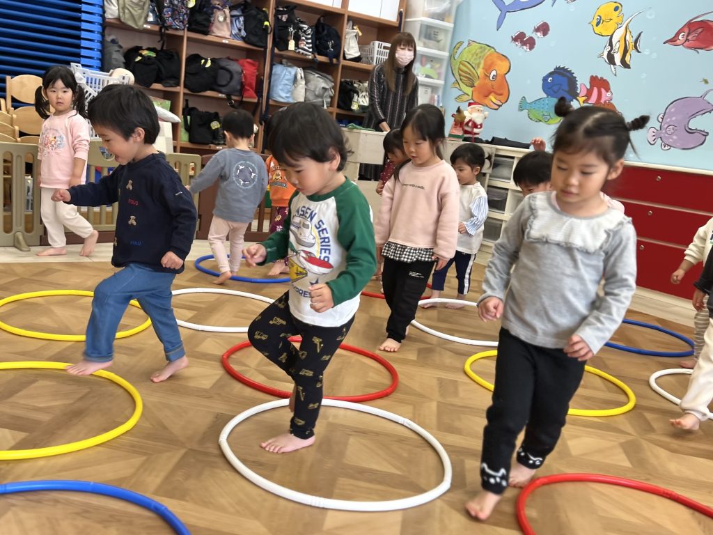 「ジングルベル」の曲が流れると、自然と体を動かしながらリズムをとる姿がとても微笑ましかったです。トナカイさんのぬいぐるみを持って踊ったり、サンタクロースに「プレゼントちょうだい!」と声をかけるなど、子どもたちのクリスマス気分はどんどん盛り上がっていきました🎅🎁