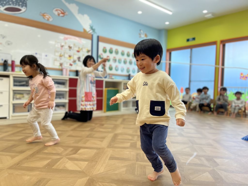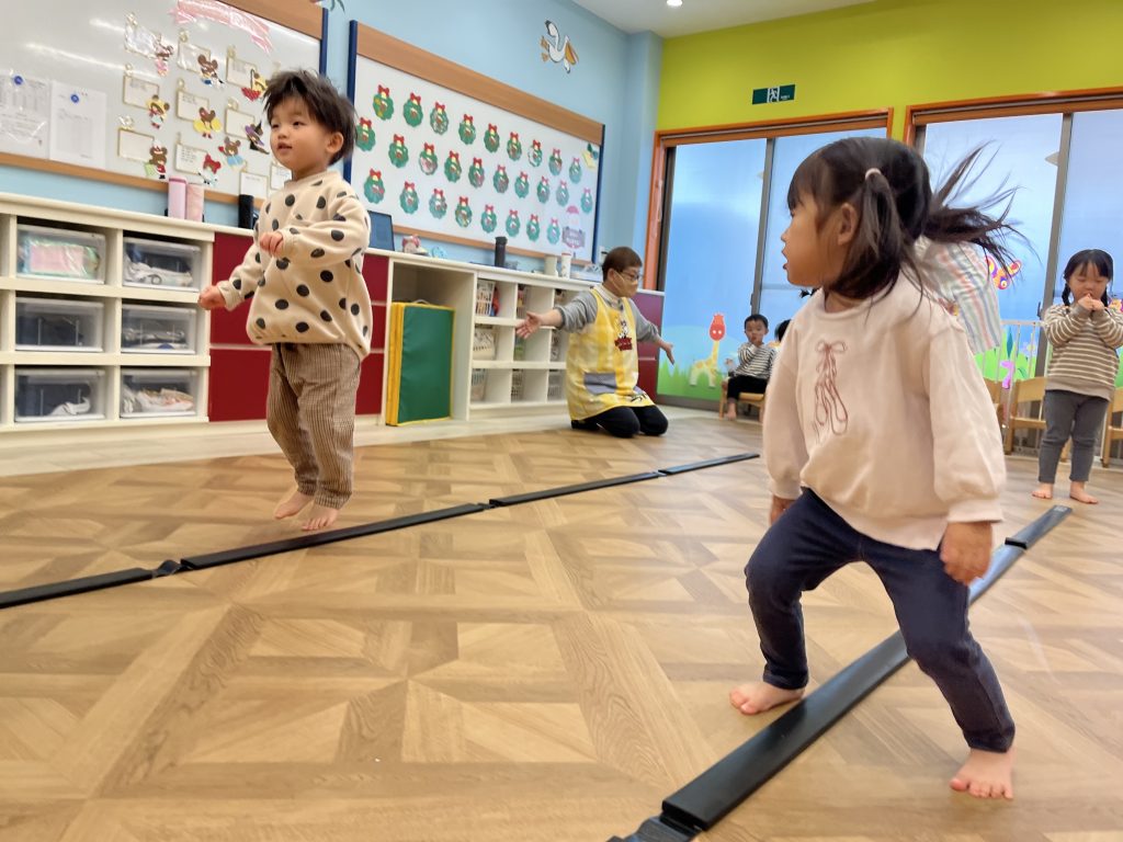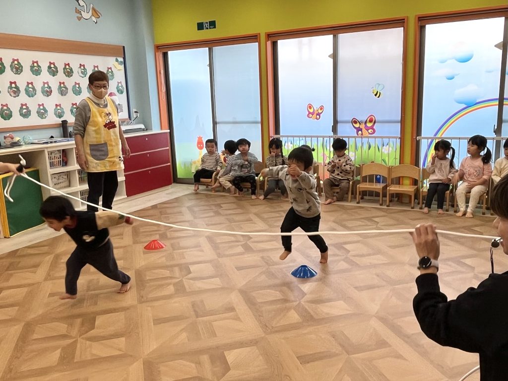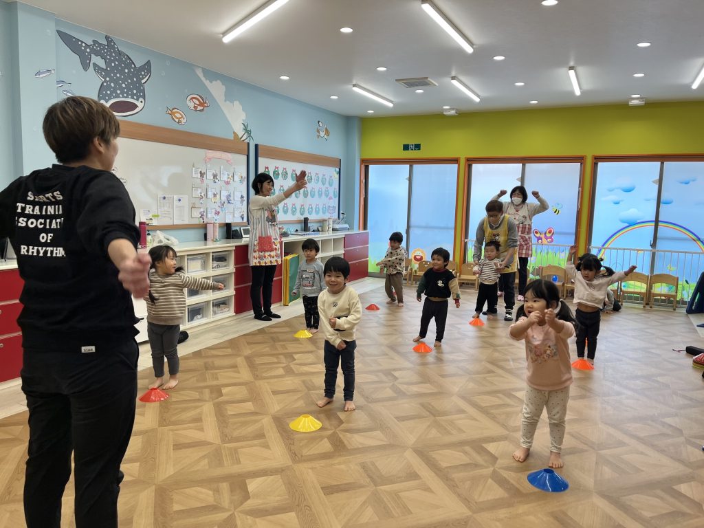 リズムに合わせて楽しくジャンプ!今日は「パージャンプを2回して左右に動く」技や、「カエルジャンプからの回転ジャンプ」に挑戦しました🐸✨少し難しいかな…?と思いきや、子どもたちは一生懸命チャレンジ!できるようになるたびに「やったー!」と笑顔がはじけていました😊みんなの成長を感じられる瞬間です!