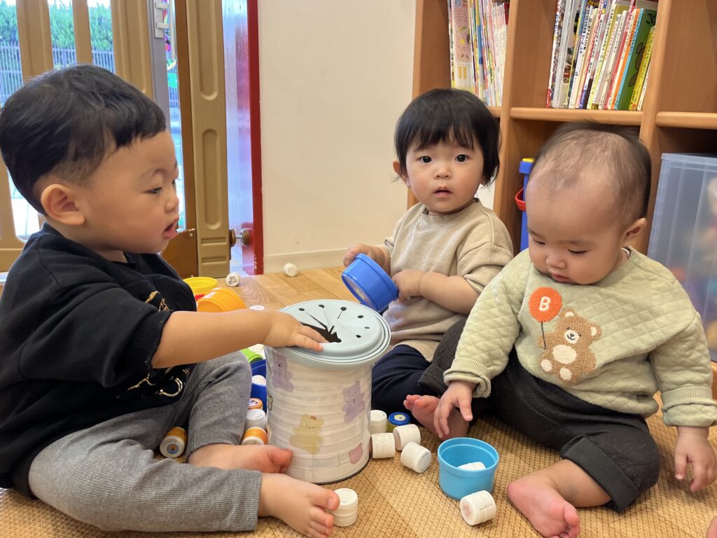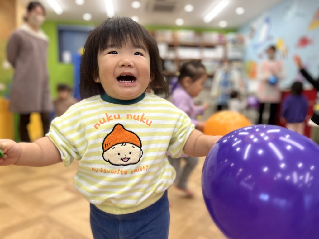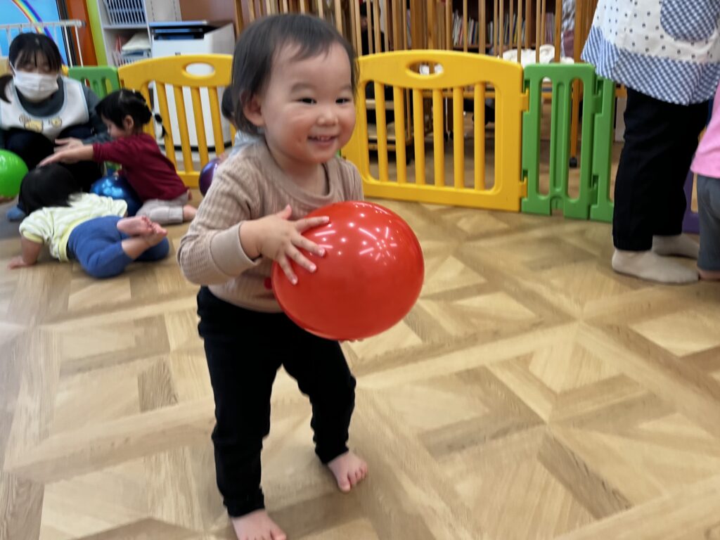 保育士と投げ合いっこを楽しんだり、自分で高く投げた風船を「キャッチ!」と上手に受け止めたり、室内いっぱいに元気な声が響いていました✨