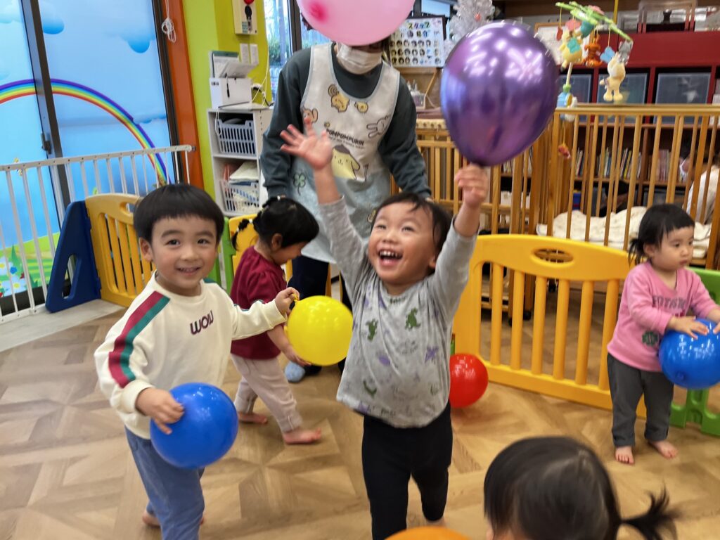 今日はあいにくのお天気☔でしたが、室内で元気いっぱい風船遊びを楽しみました!