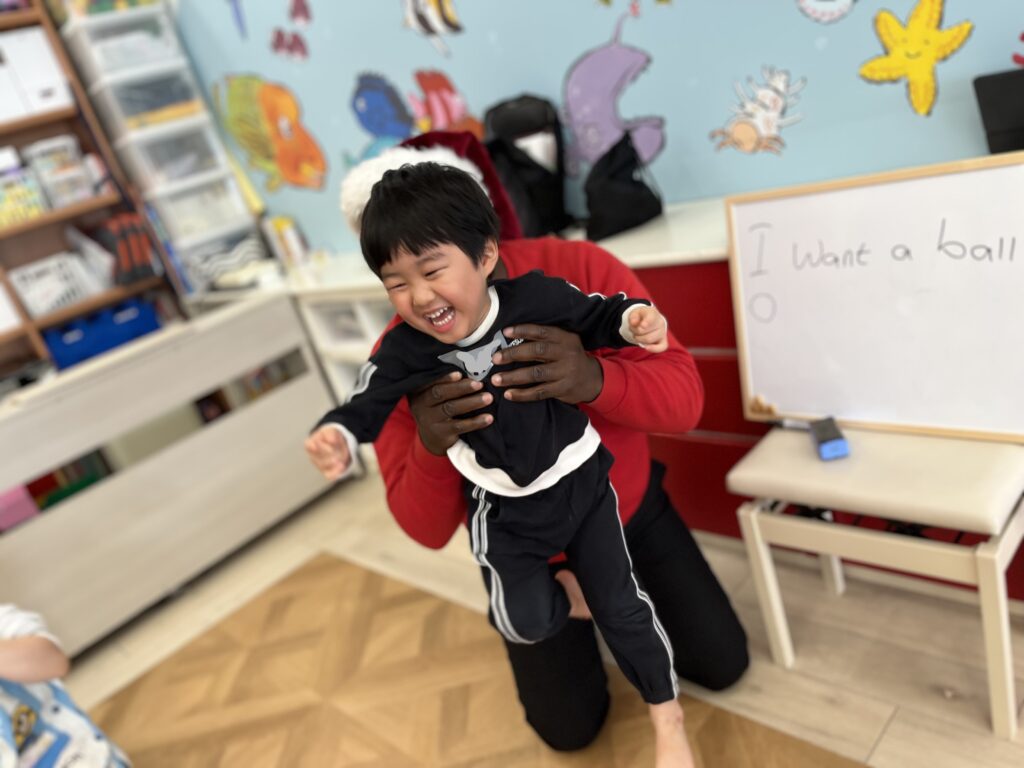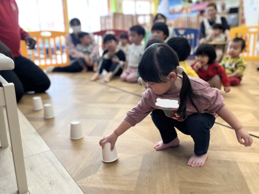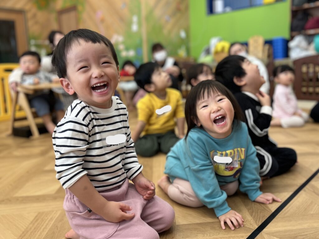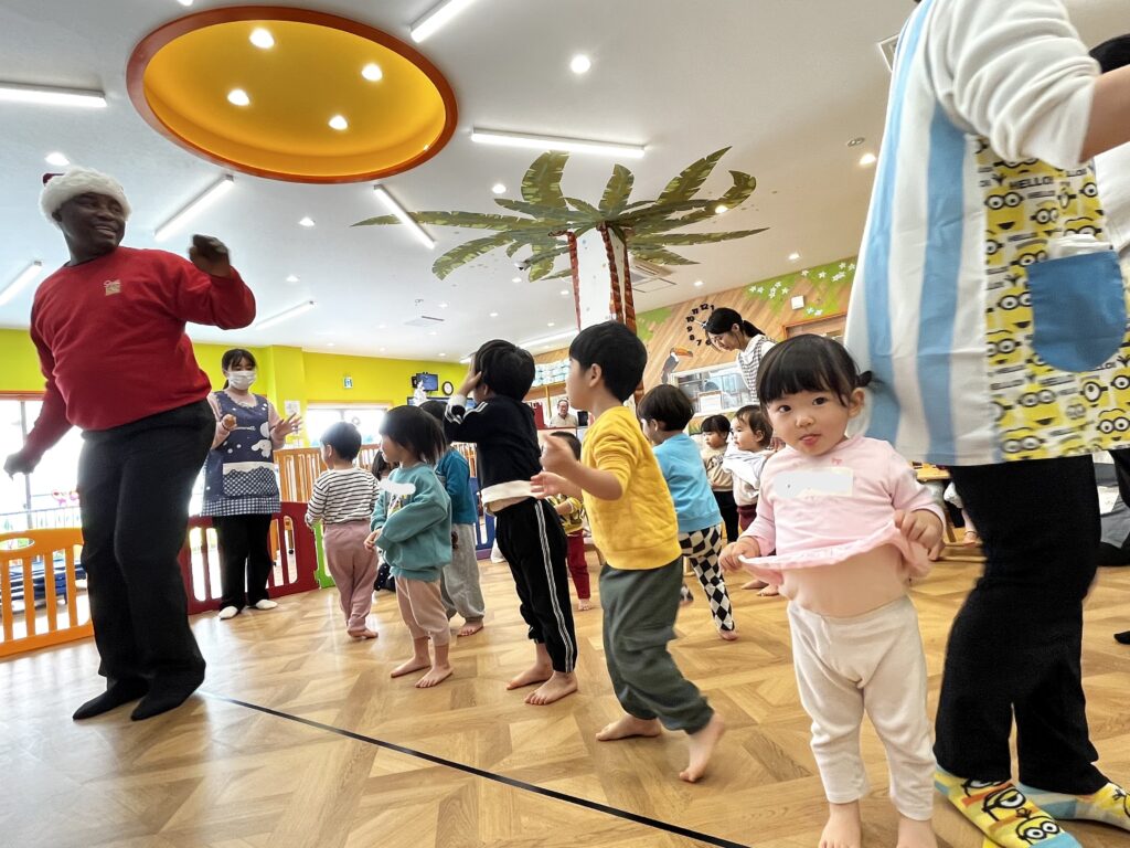音楽に合わせて体を動かしたり、絵本のイラストを見ながら先生の発音を真似したりと、みんなとても楽しそうでした。