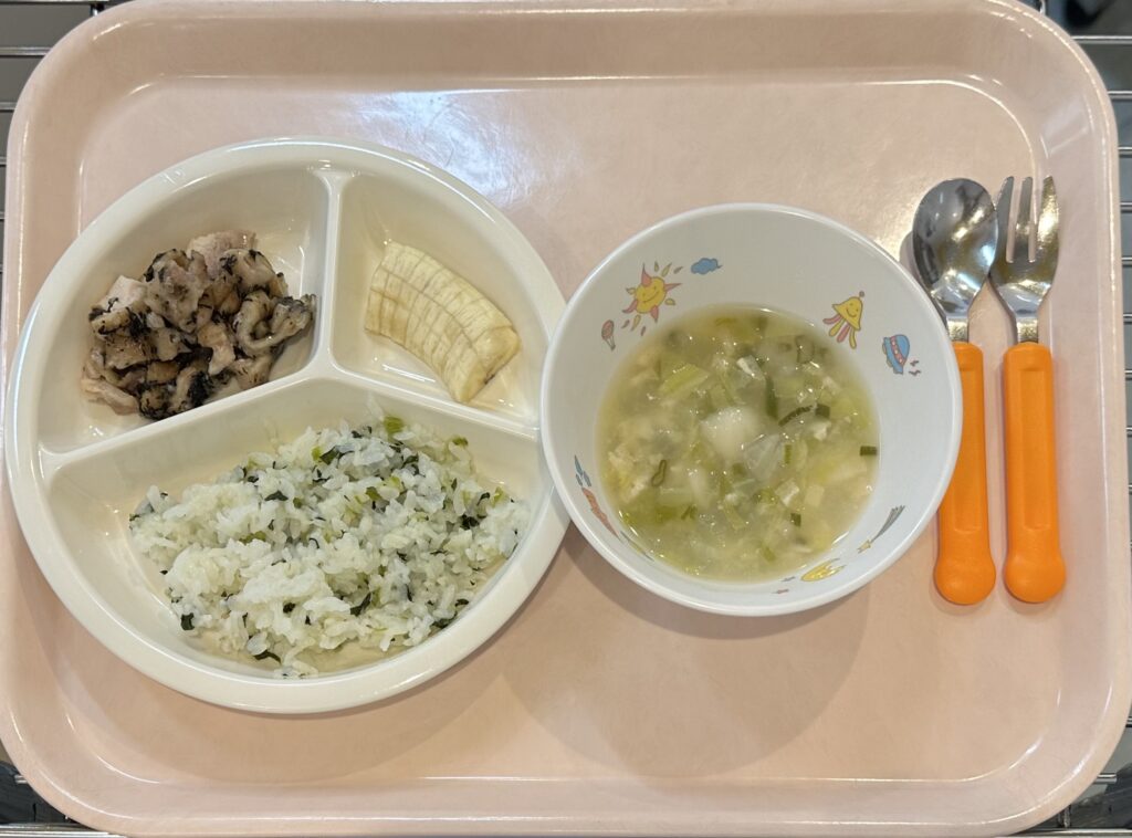 菜飯,みそ汁(だいこん・油揚げ),鶏の海苔焼き,バナナ