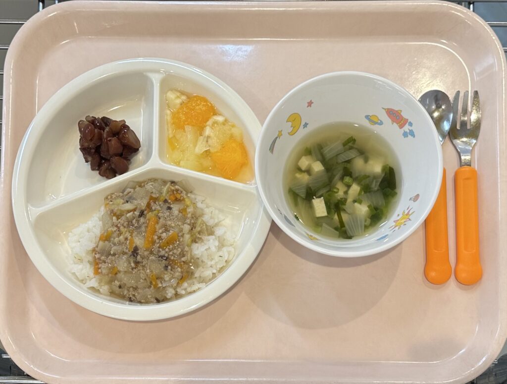 中華丼(はくさい),豆腐すまし汁(わかめ),甘煮豆,フルーツカクテル