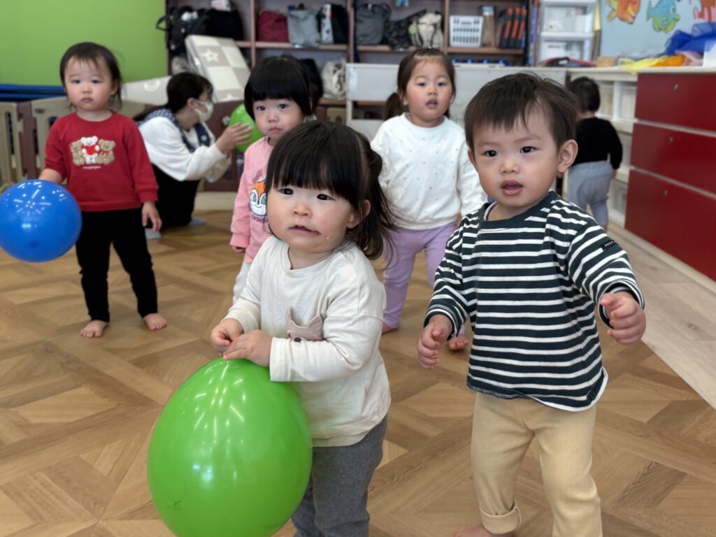 小さいお友達はお部屋の中で、カラフルな風船を追いかけたり、投げたりと、元気いっぱいの風船遊び🎈