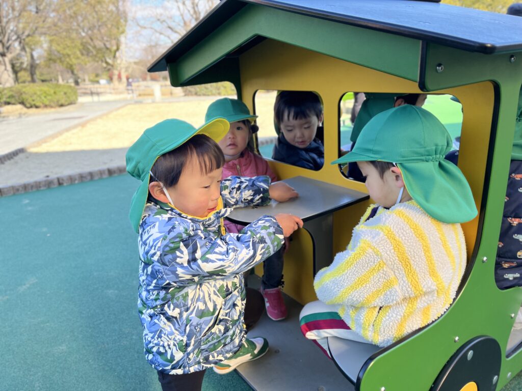 大きいお友達は、「春日公園に行きたい!」という声があがり、春日公園の遊具広場へ出発しました。