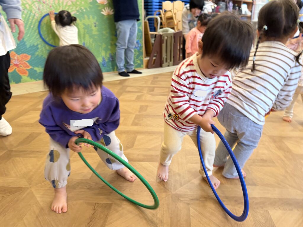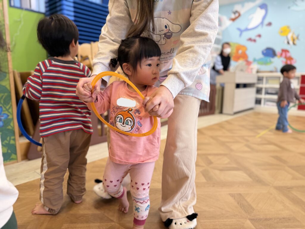 ですが、ピアノの音が聞こえてきたり、フープや鈴が登場すると、少しずつ気持ちも落ち着き、音に合わせて体を動かす姿が見られるように😊🎵