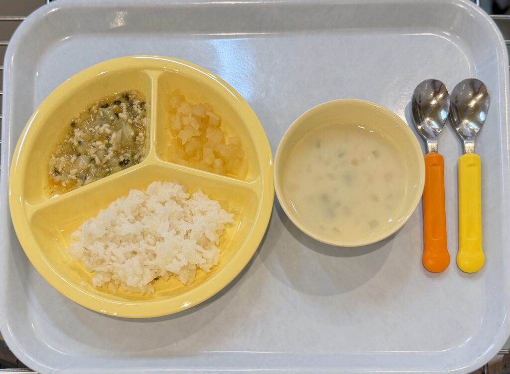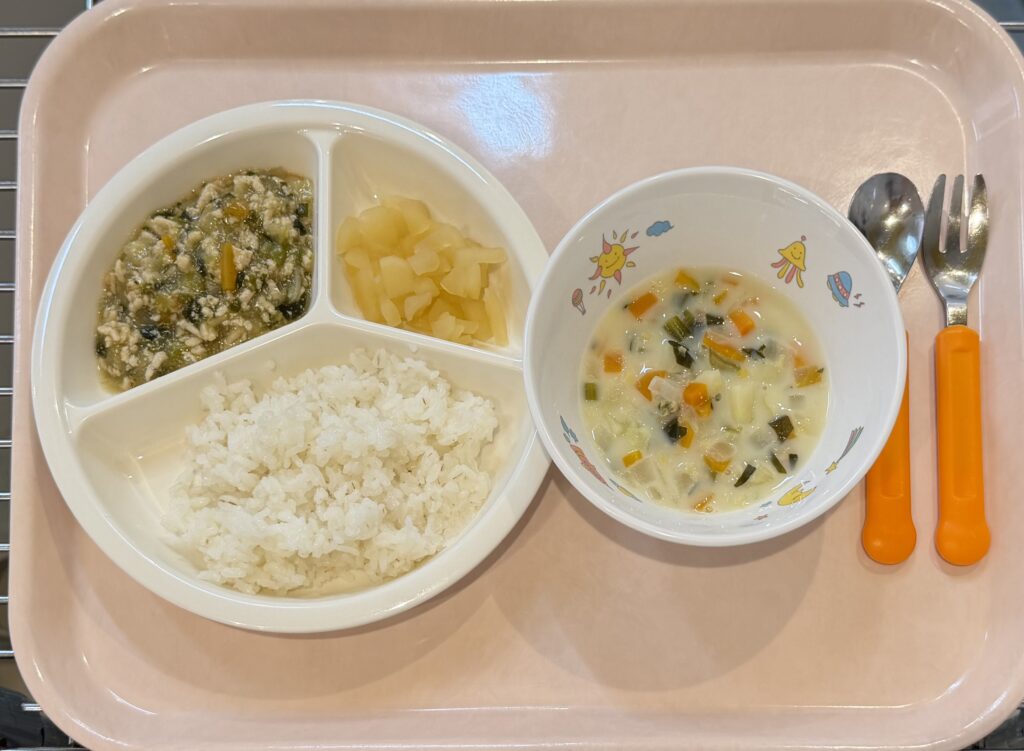 埌期 ご飯、鶏のそがろ煮鶏ミンチ、キャベツ、小束菜、人参