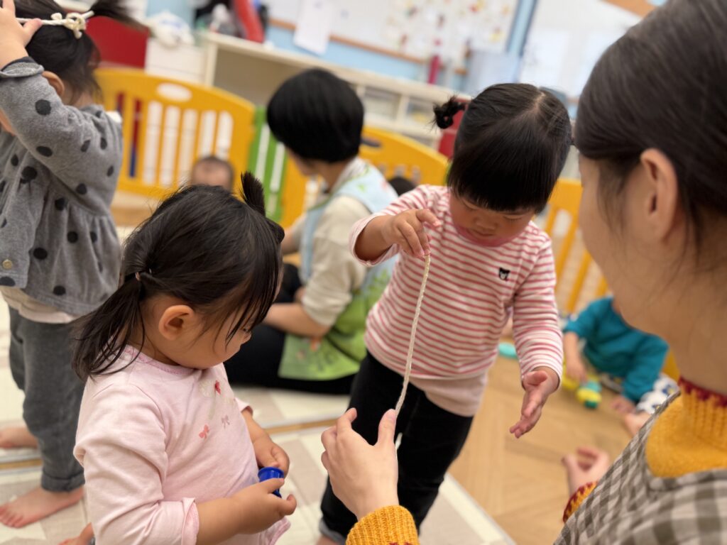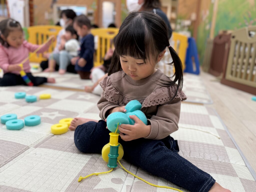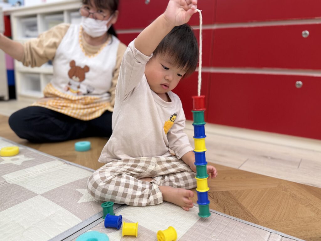 穴のあいた玩具に紐を通し、みんな真剣な表情で取り組んでいました。通せた時の達成感で、自然と笑顔に✨