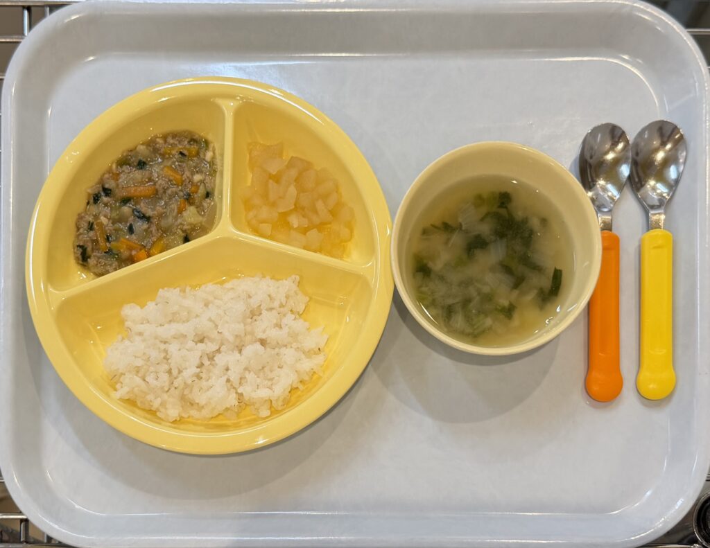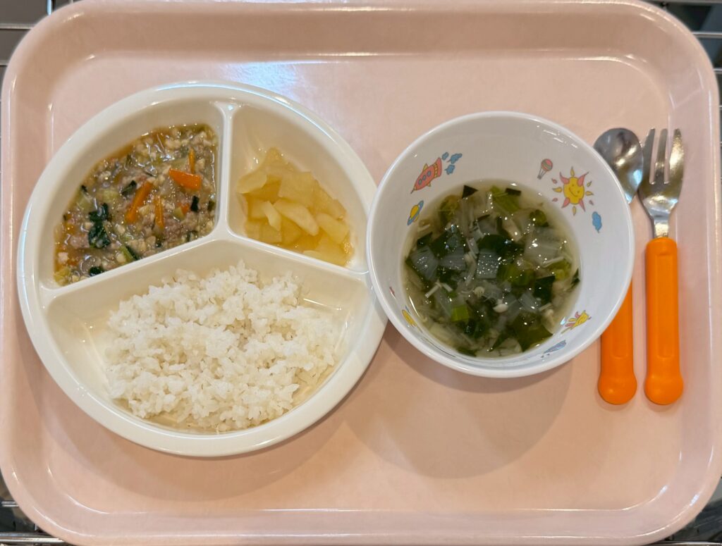 御飯,みそ汁(もやし・えのき),野菜そぼろ丼,煮りんご