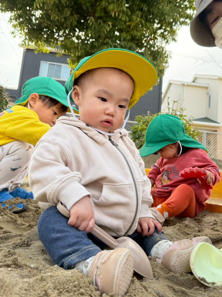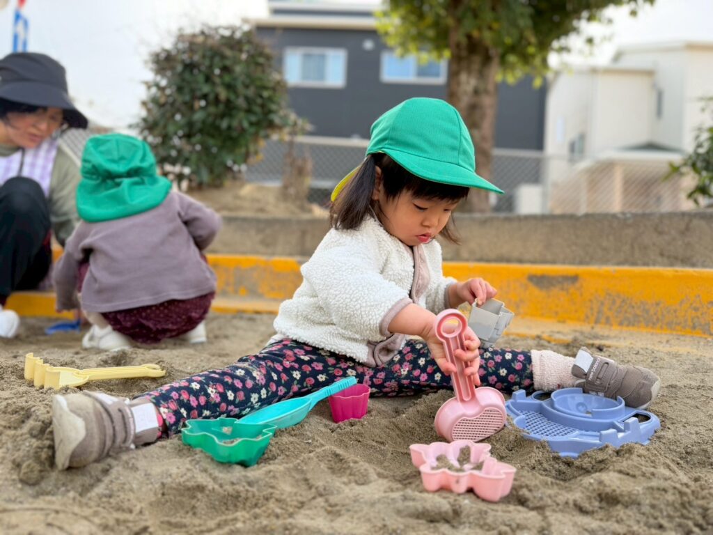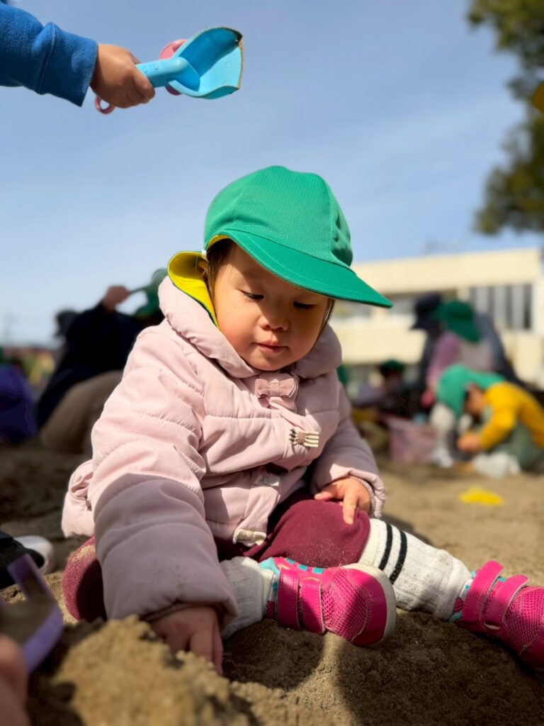 お友だちや保育士と一緒に山を作ったり、バケツに砂を集めたりと、思い思いに砂遊びを楽しんでいました。