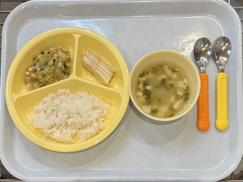 みそ汁(豆腐、玉ねぎ、えのき、にら)、バナナ