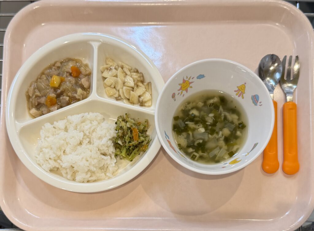 出汁スープ(玉ねぎ、えのき、わかめ)、バナナ
