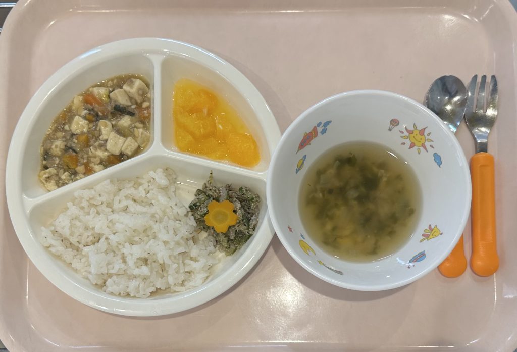 御飯,わかめスープ(コーン),マーボー豆腐(キッズ),きゅうりのごまあえ,オレンジ