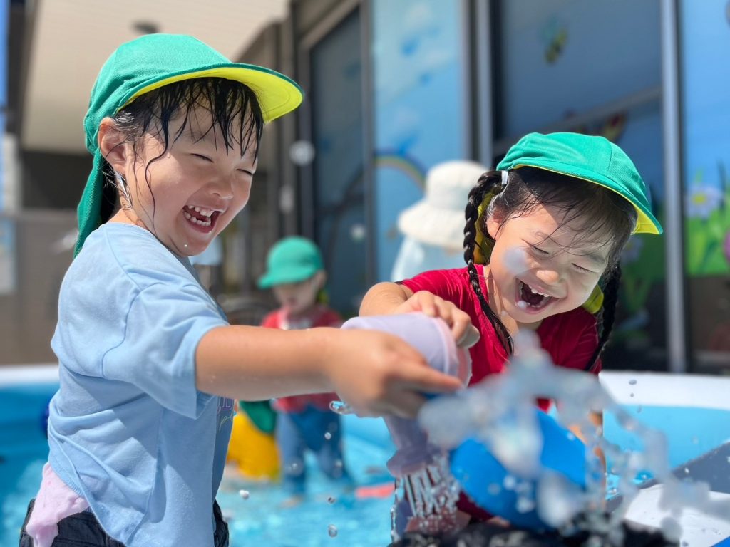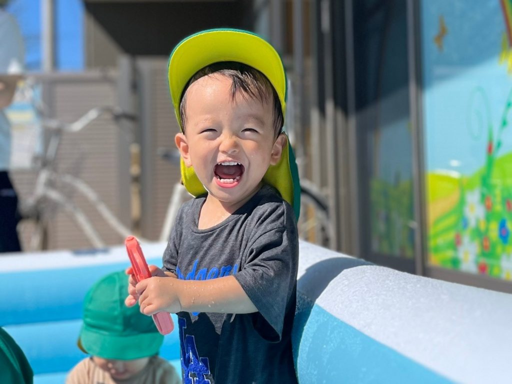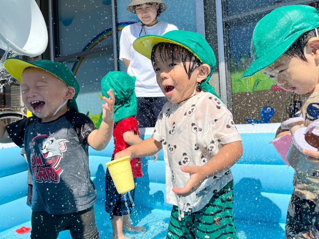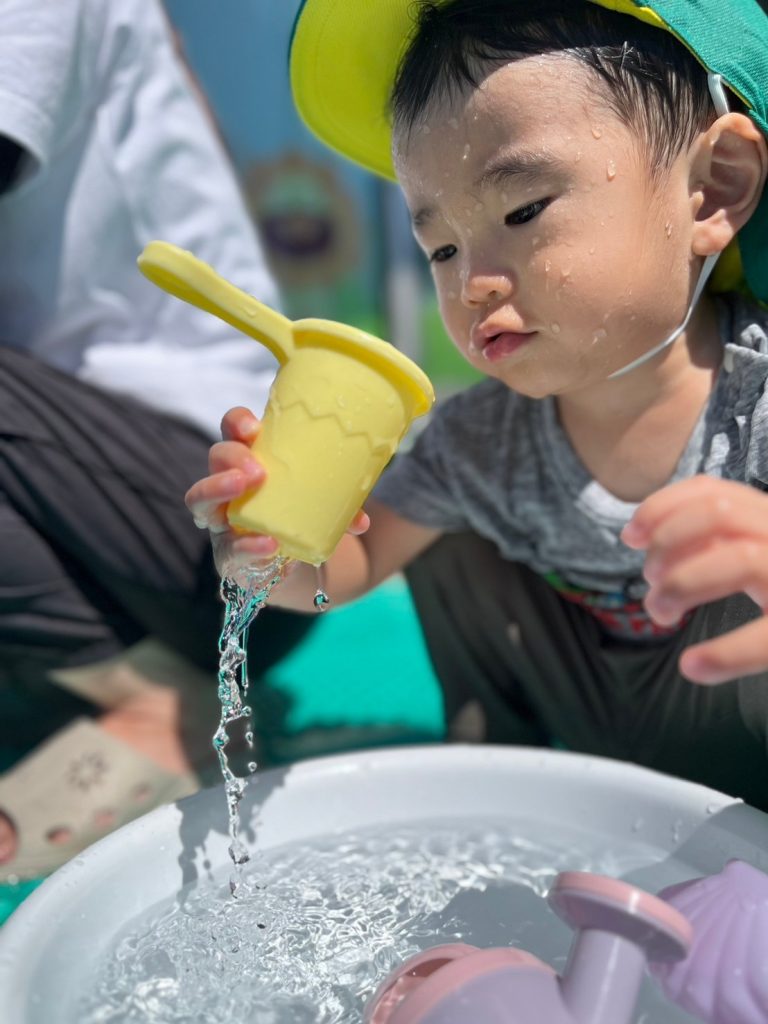 これまで顔に水がかかるのを少し嫌がっていた子どもも、今日はなんと自らホースのシャワーに近づいていきました!💧水がピューピューと出てくるたびに「わぁ〜!」と大はしゃぎ!その笑顔がとってもキラキラしていました😊
