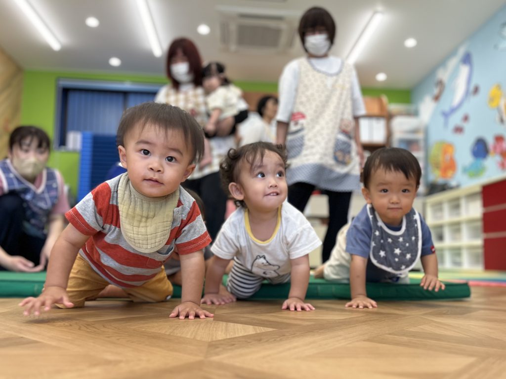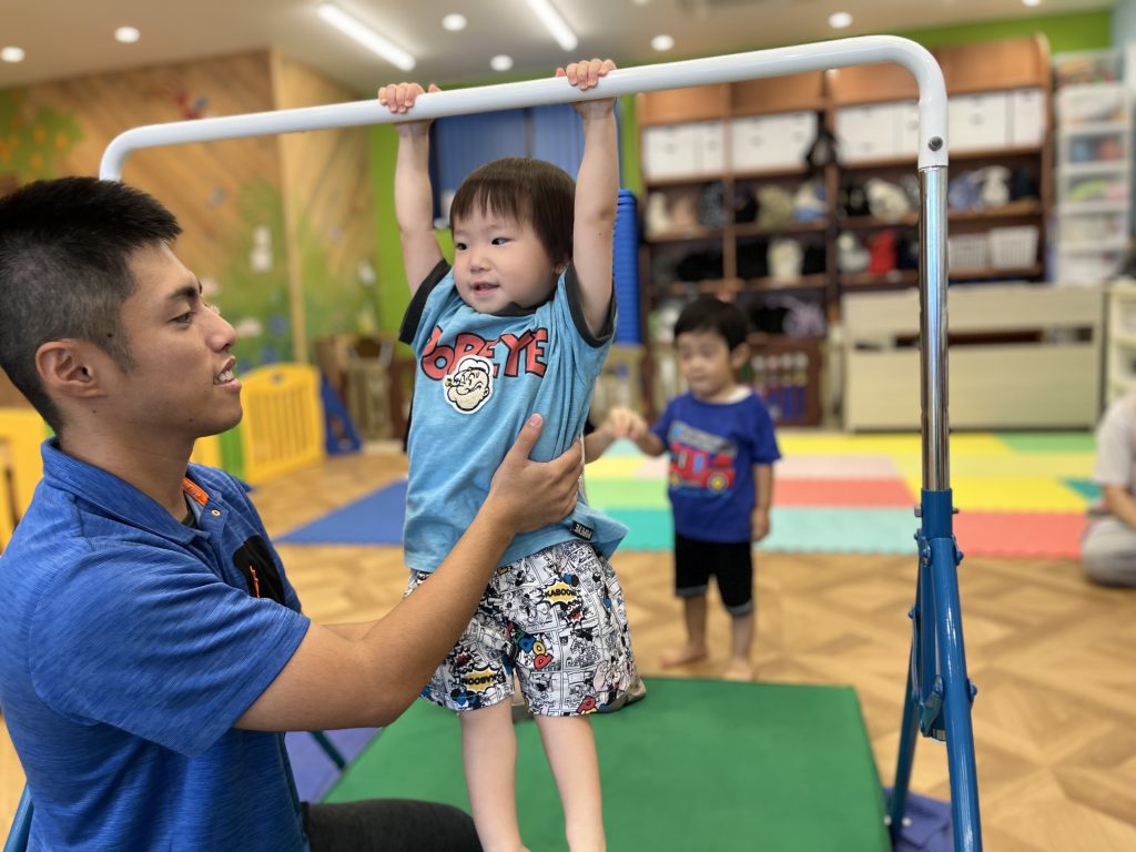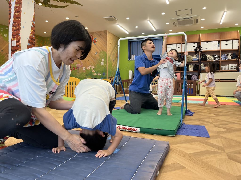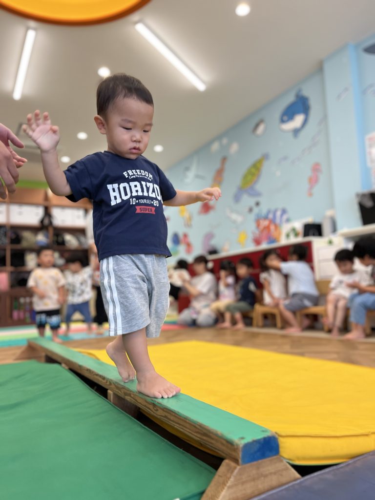 まずは鉄棒!2歳児さんたちは、ぶら下がりがとっても上手になってきましたよ✨ みんな、しっかりと力を入れて頑張っていました💪 でも、足抜き回りに向けたこうもりさんは少し難しいみたい…🦇 みんなで「できるようになるぞ!」と一生懸命取り組んでいます!