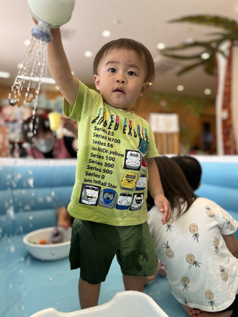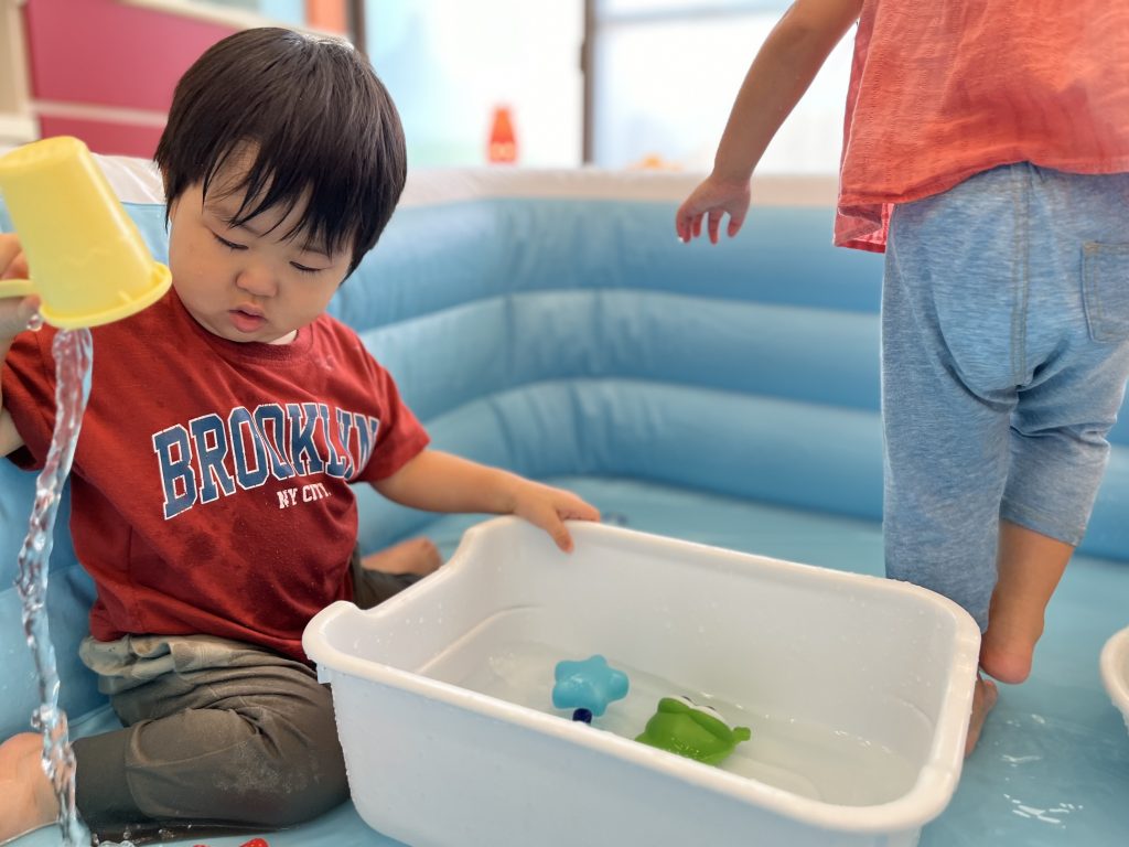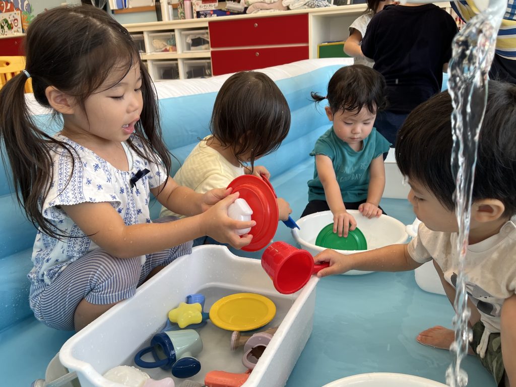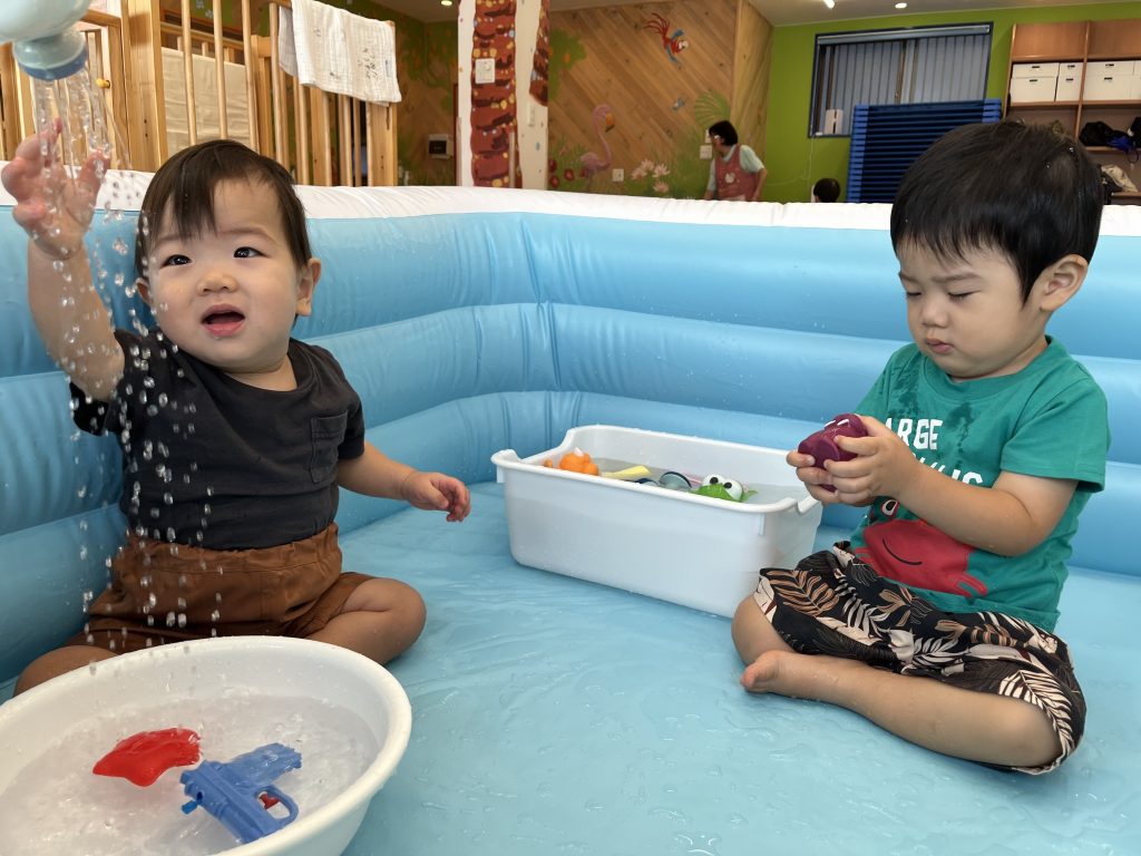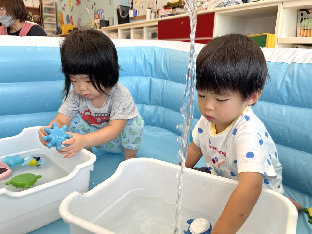 少しだけ「どんな風に遊ぶのかな?」と戸惑う子もいましたが、すぐに洗面器や桶の水で遊び始め、たくさんの笑い声が聞こえてきましたよ。ちょっとした水のこぼれちゃったハプニングも、みんなで楽しみながら大盛り上がり♪ プール遊びに慣れている子たちばかりだったので、みんな笑顔で水に触れ、暑さも吹き飛びました!😆